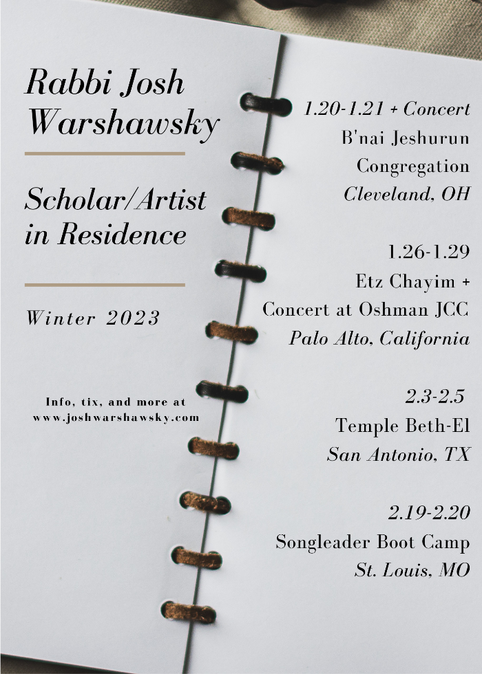 Join us this year for an exploration of the weekly Torah portion and the story of the Jewish people in connection and conversation with my musical compositions. Through this journey, I hope we find deeper meaning in these melodies, stronger ties to our tradition, and true relevance to the work we are doing in the world today. I’m not exactly sure where this journey will lead, though I hope it will lead to new conversations, new ideas, new relationships, new inspiration, and new music. I’d love to hear your thoughts along the way.